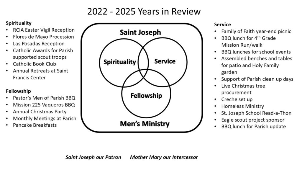 The Saint Joseph Men’s Ministry (SJMM) 2022–2025 Years in Review highlights a period of spiritual growth, community outreach, and renewed brotherhood. It highlights our Mission in action of Spirituality, Fellowship and Service to others. Over these three years, SJMM deepened its mission through retreats, fellowship gatherings, and service projects that strengthened both faith and fellowship. The ministry also embraced digital tools to stay connected during challenging times, while continuing to mentor new members and support parish life. This journey reflects a vibrant commitment to lour living out Catholic values in everyday life. We thank all our many members for their dedication and continued support of our Ministry and Parish.